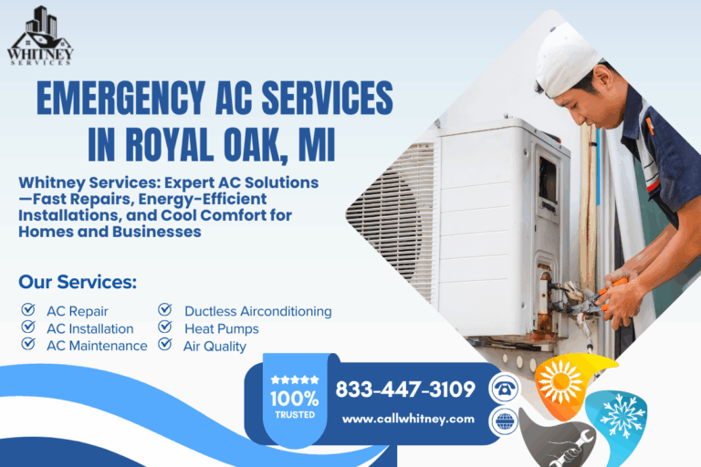 A malfunctioning air conditioning system can quickly turn a comfortable home or office in Royal Oak into an uncomfortable space, especially during the peak summer months. That’s why having access to reliable emergency AC services in Royal Oak is essential. Whitney Services offers 24/7 emergency support to ensure that your cooling system is back up and running quickly, safely, and efficiently. With licensed technicians and fast response times, you can trust Whitney Services to handle any AC crisis, no matter when it occurs.