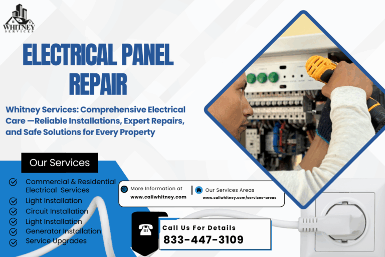 Electrical panel repair is essential for the safety, reliability, and efficiency of your home or business. Ignoring signs of panel issues can lead to dangerous situations and costly damage. Professional services from Whitney Services provide peace of mind, ensuring your electrical system operates safely and effectively. Don’t wait until a small problem becomes a major hazard. Contact us today for expert electrical panel repair you can trust.